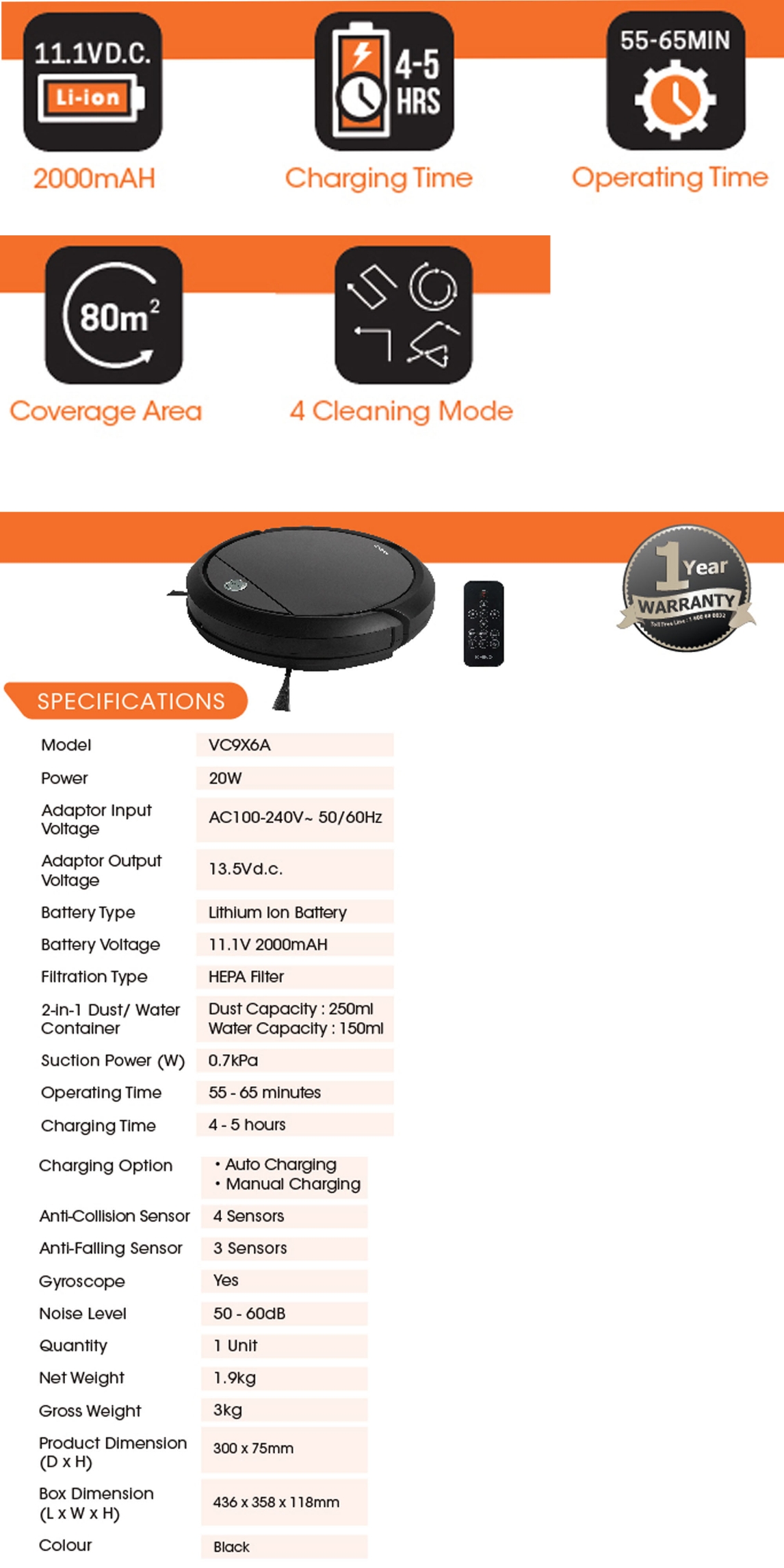 Even though the stated operating time is 55-65 minutes, somehow the vacuum manages to keep sweeping for straight two hours and our house is always adequately clean enough with all ground floor areas covered (living room, dining area and kitchen).